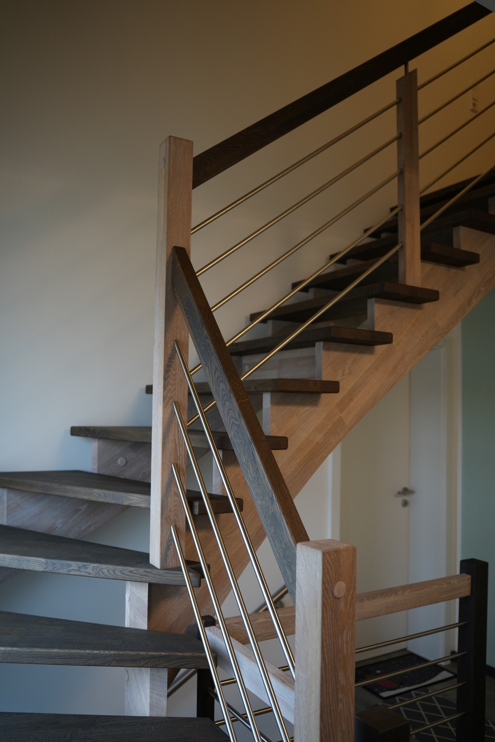 Das Geländer wird hier auf den Treppenstufen befestigt, was eine Vielzahl von verschiedenen Geländertypen ermöglicht. Die aufgesattelte Wangentreppe kann mit der eingestemmten Variante kombiniert werden, was der Treppe einen außergewöhnlichen und exklusiven Look verleiht.